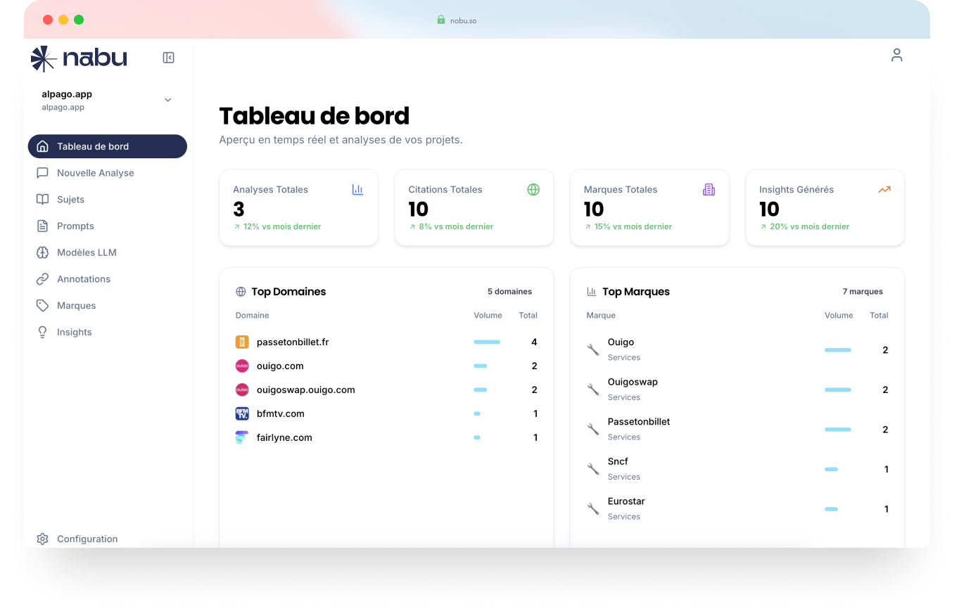 Nabu est l’outil de Generative Engine Optimization (GEO) qui mesure, compare et améliore votre visibilité dans ChatGPT, Perplexity, Gemini et les autres moteurs IA